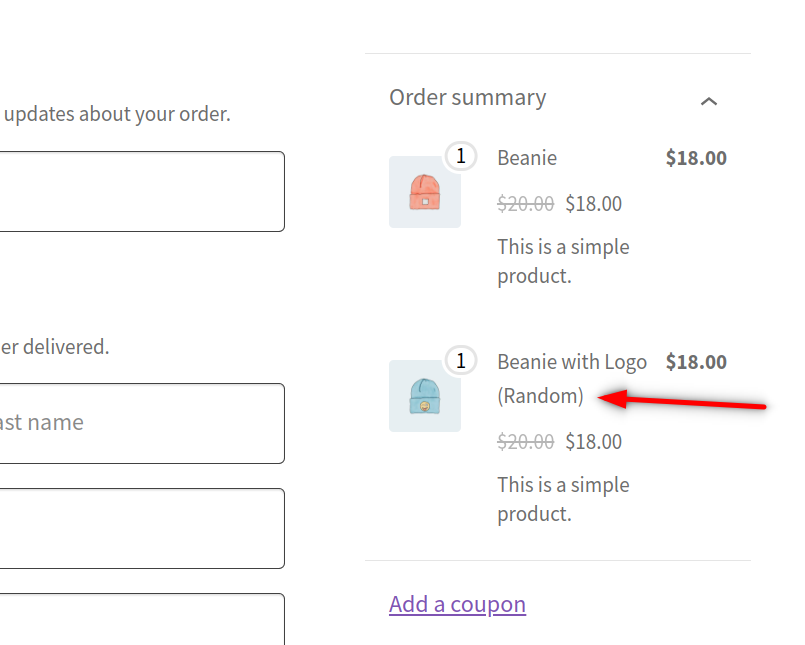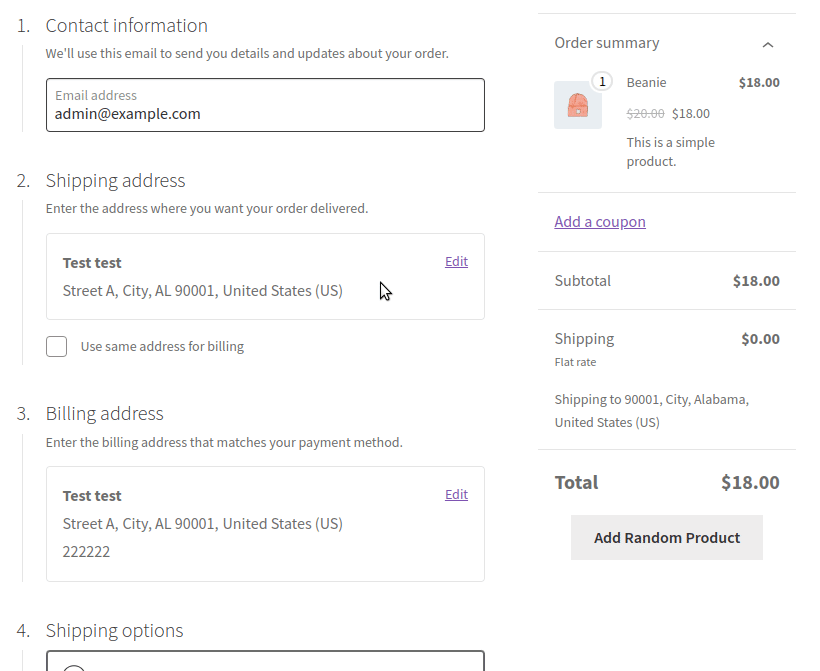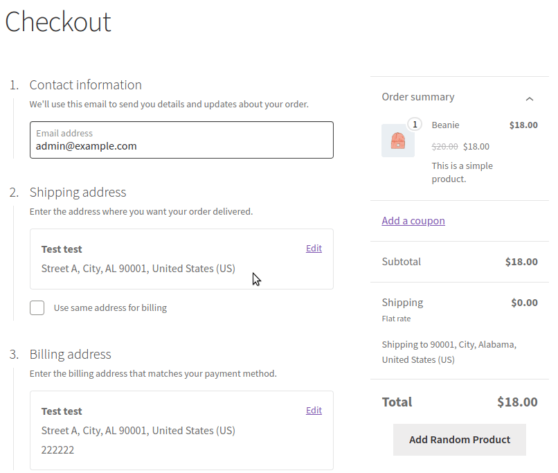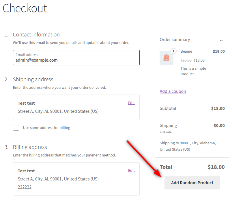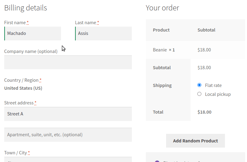 O plugin de exemplo exibe o botão “Add Random Product” na página de checkout acima dos métodos de pagamento. Ao clicar no botão, um produto aleatório é adicionado ao carrinho. Além disso, o nome do produto aleatório adicionado aparece no carrinho com “(Random)” para identificar que foi adicionado pelo plugin. No gif abaixo podemos ver o funcionamento do plugin na página de checkout clássico (usando o shortcode [woocommerce_checkout]).