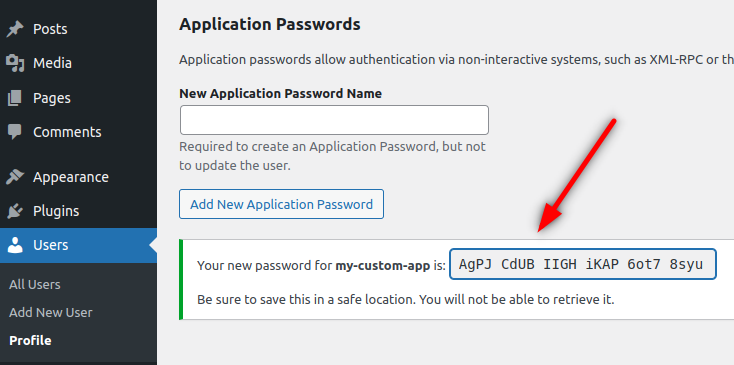 }Precisamos enviar uma requisição autenticada. Para isso vamos criar uma senha de aplicação (disponível a partir da versão 5.6) para o nosso usuário no WordPress. A senha de aplicação é criada na página de edição do usuário (wp-admin -> Users -> Edit User).